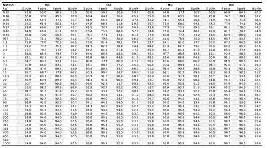 Bảng 1 : Giá trị hiệu suất tối thiểu ở 50Hz được xác định theo tiêu chuẩn IEC/EC 60034-30-1:2014